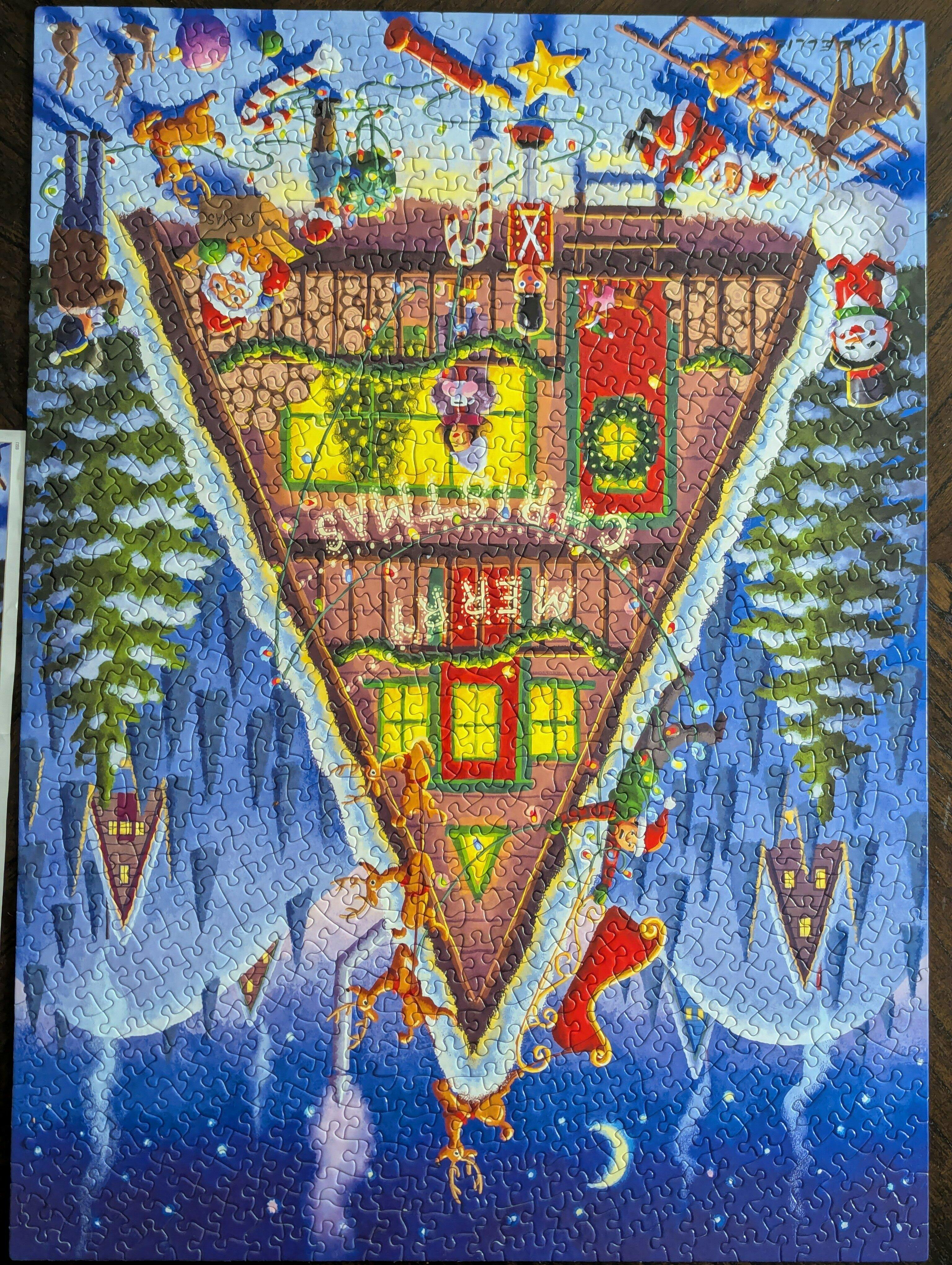This painting is inspired by Clark Griswald’s over-the-top decorating in the movie Christmas Vacation. The artist envisioned Clark taking his skills to a remote mountain cabin. This image is the tacky result of bad taste and over decorating! Have fun putting together the worst, and at the same time best, Christmas Cabin. What fun folly will you discover? Christmas Cabin is part of our Holiday Collection.