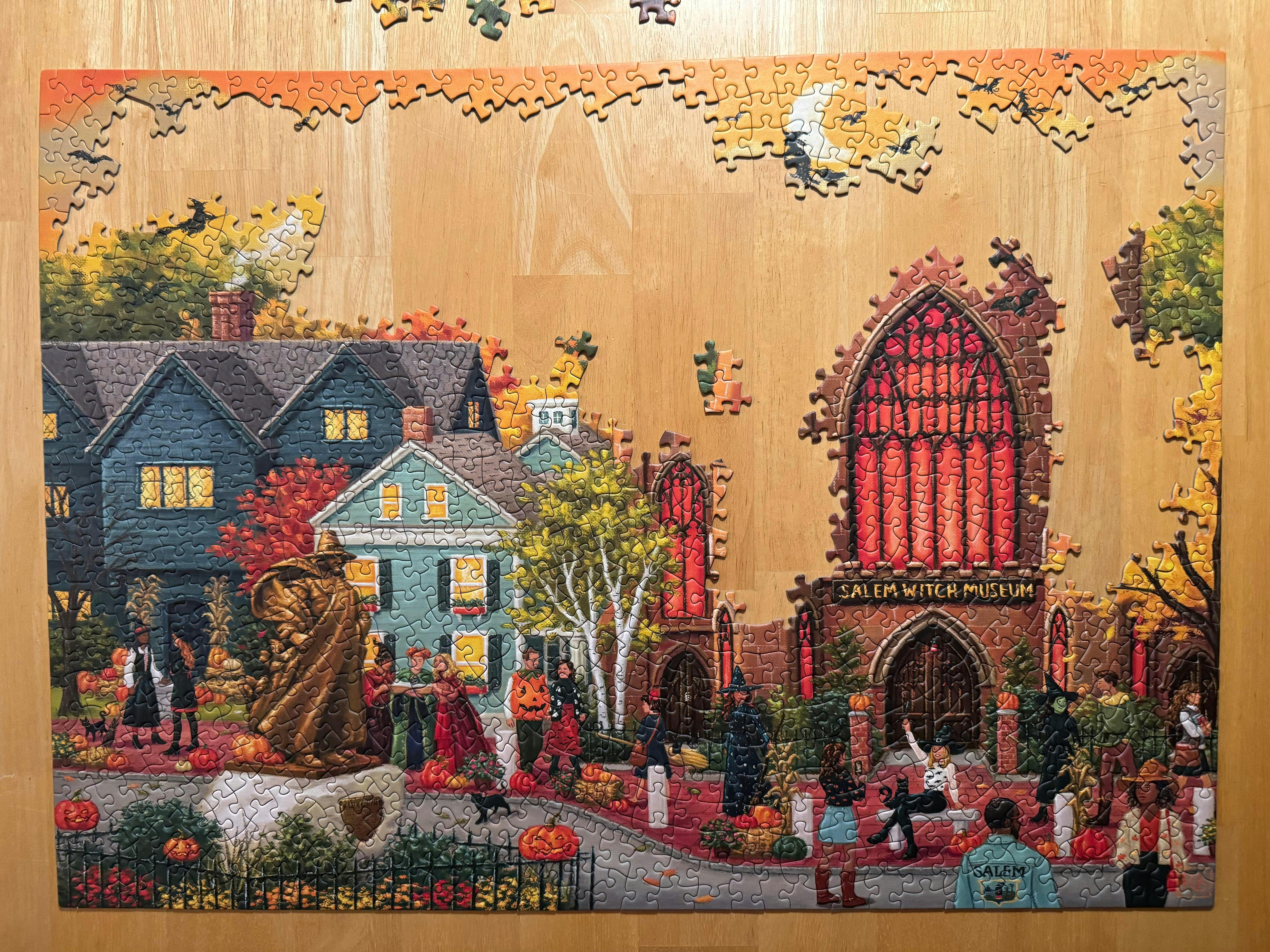 Billy Bob's Family Farm is alive with Halloween antics. Colorful scarecrows watch as a variety of interesting characters navigate the corn maze. The spooky trees and clouds in the haunted forest set the backdrop for this fun painting, making it a fascinating challenge for puzzlers, or great artwork for a Halloween decoration.