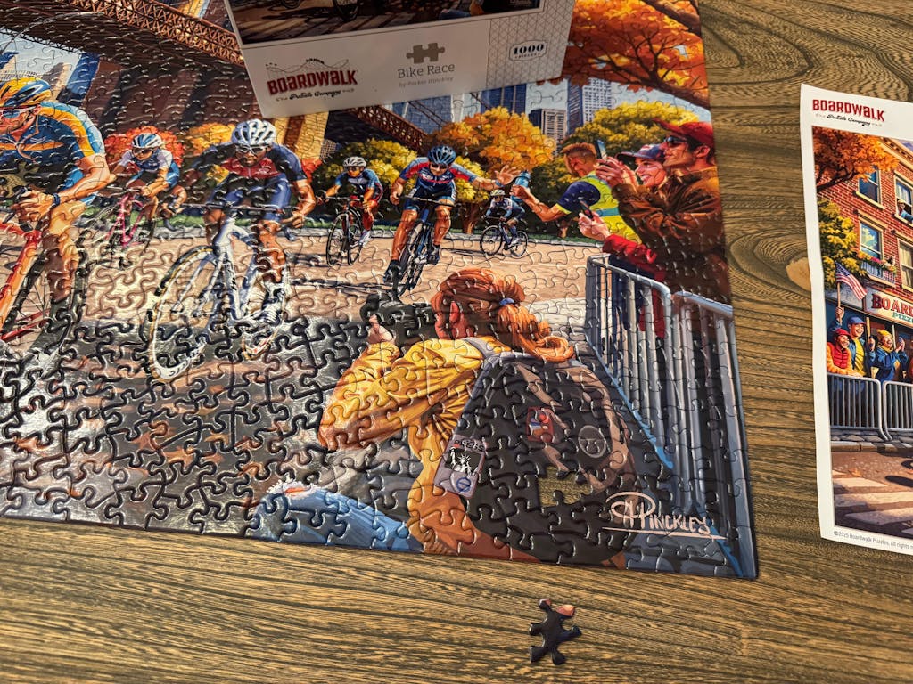 Cyclists speed alongside the great bridge in Brooklyn, New York. Bike Race takes place on a perfect fall day with the Freedom Tower and New York City skyline rising in the background. Some discoveries include the Boardwalk Pizzeria, a bike named after our Speedmaster™ puzzle brand, another bike branded BWP for Boardwalk Puzzles, and a cat taking in the view. Bike Race is part of our Outdoor Adventure Collection.