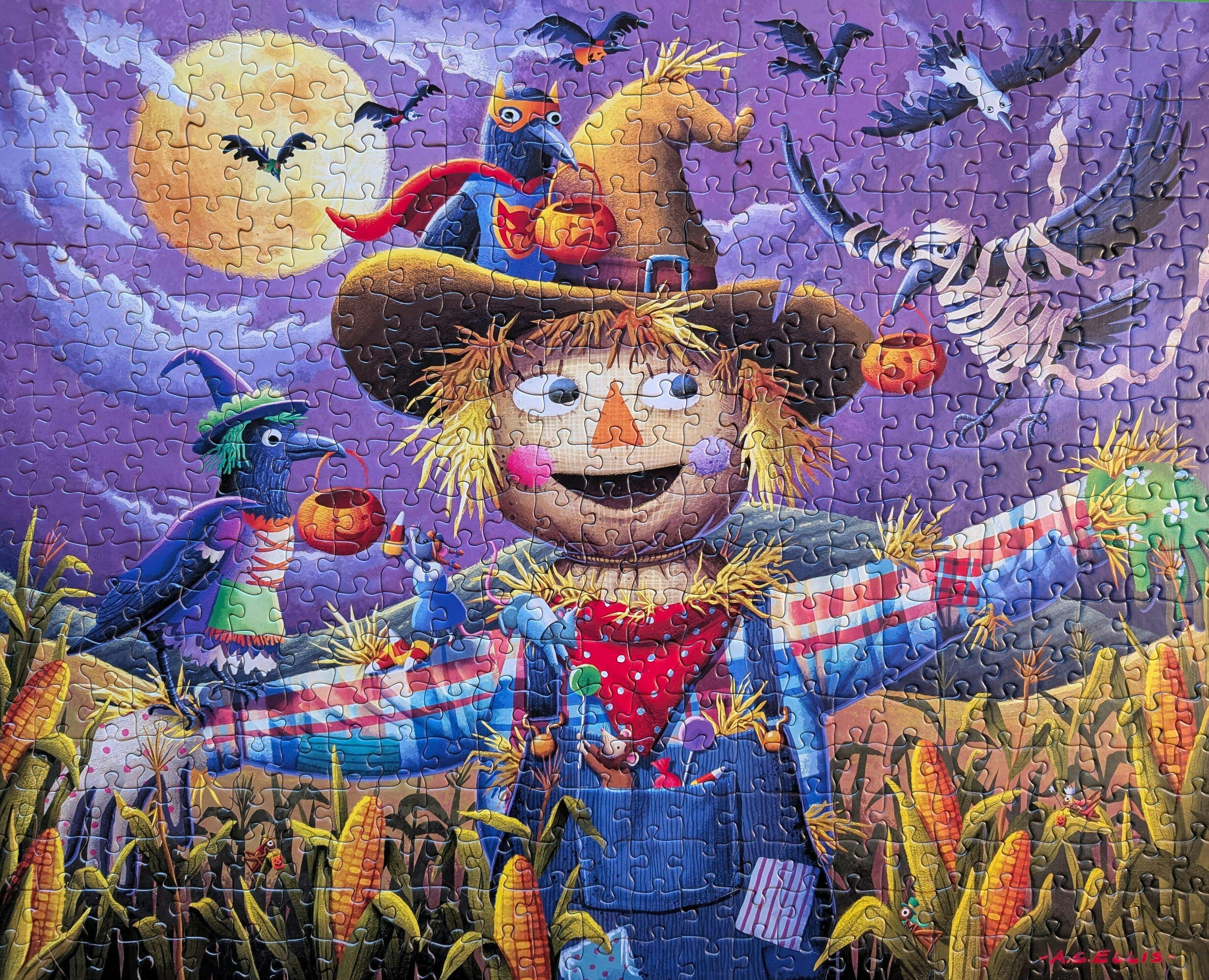 This Scarecrow is way too nice and not at all scary. He’s actually attracting crows rather than keeping them away. In fact, the crows have dressed for Halloween, with witch crow, mummy crow, ghost crow, Abraham Lincoln crow, Jack-o-lantern crow, vampire crow, and Robin Hood crow. And since this cornfield is in Kansas, the scarecrow’s mice friends are dressed up like Dorthy, the Tin Man and Lion to hand out candy. Scarecrow is part of our Holiday Collection.