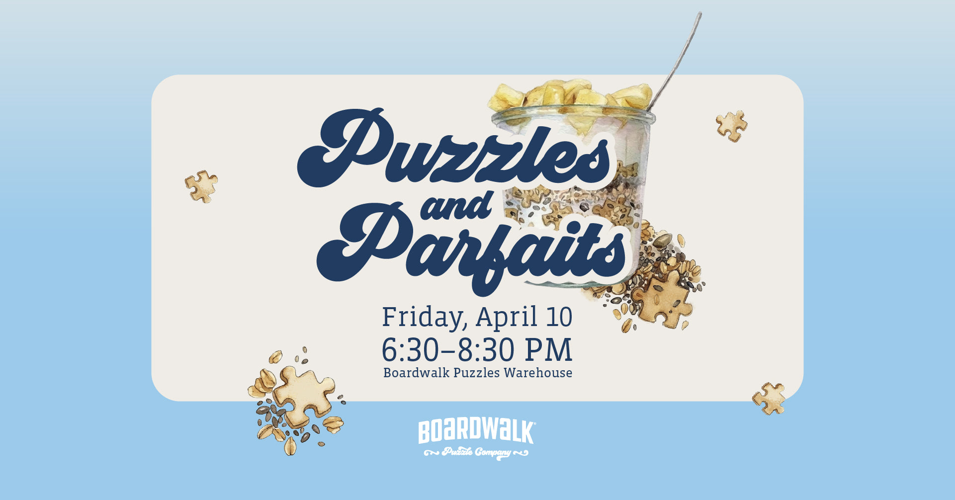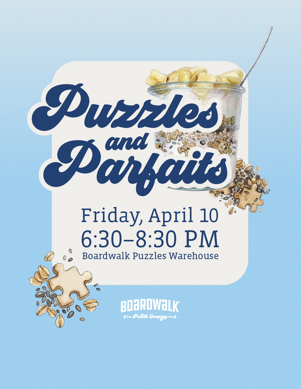 Ready for a sweet and relaxing night out? Join us at the Boardwalk Puzzles Warehouse for a delightful evening of jigsaw puzzles and delicious parfaits! Whether you're a seasoned puzzle master or just looking for a cozy way to welcome the Spring season, it's the perfect opportunity to socialize, piece things together, and treat yourself to something tasty.