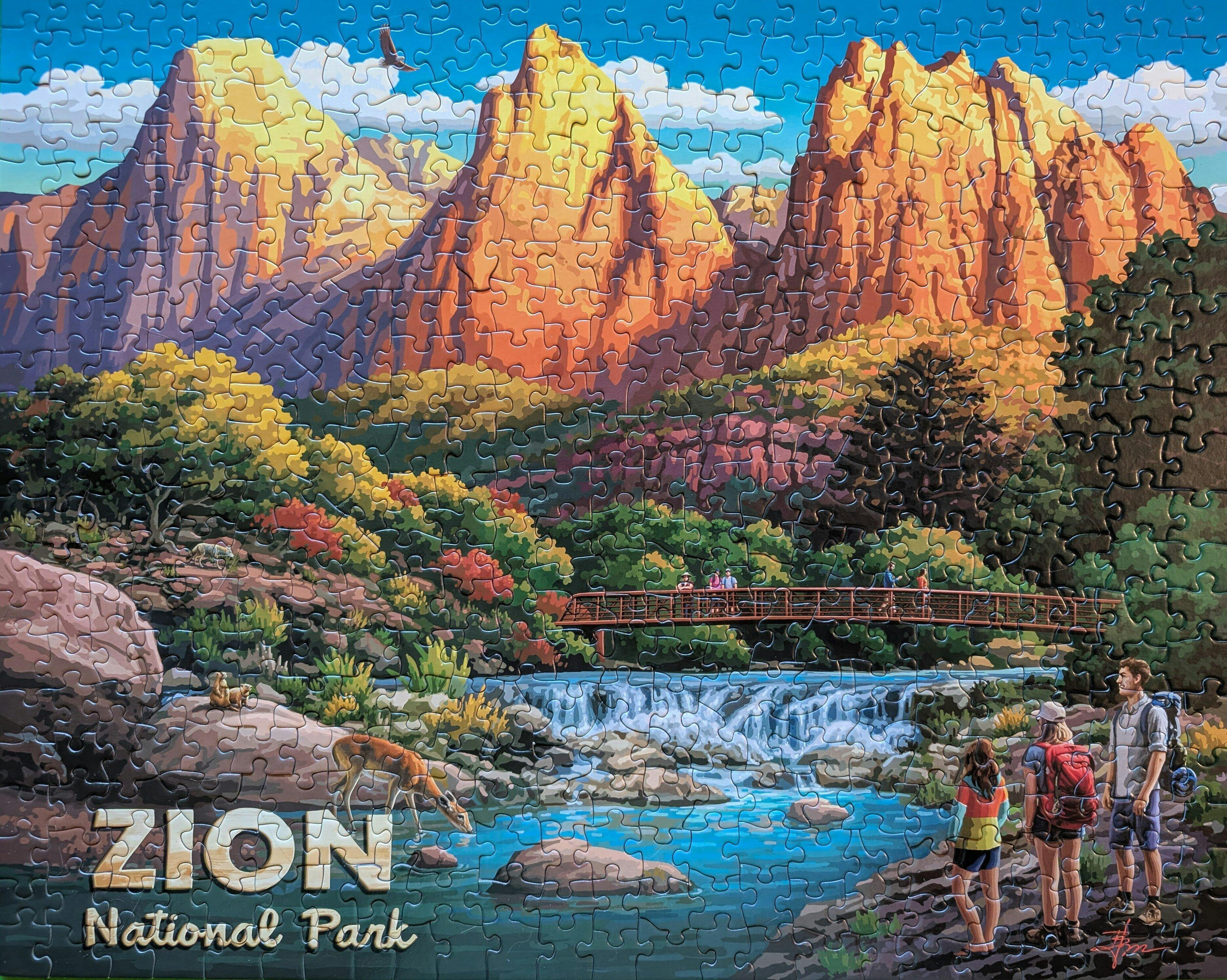Located in southwest Utah, Zion is the third most visited National Park in the United States. The park boasts a wide variety of hikes from red-rock slot canyons to a 1,500-foot rock formation called Angels Landing. The “Three Sisters” is a giant rock formation that creates the dramatic backdrop of this painting. This puzzle is part of our National Parks Collection.